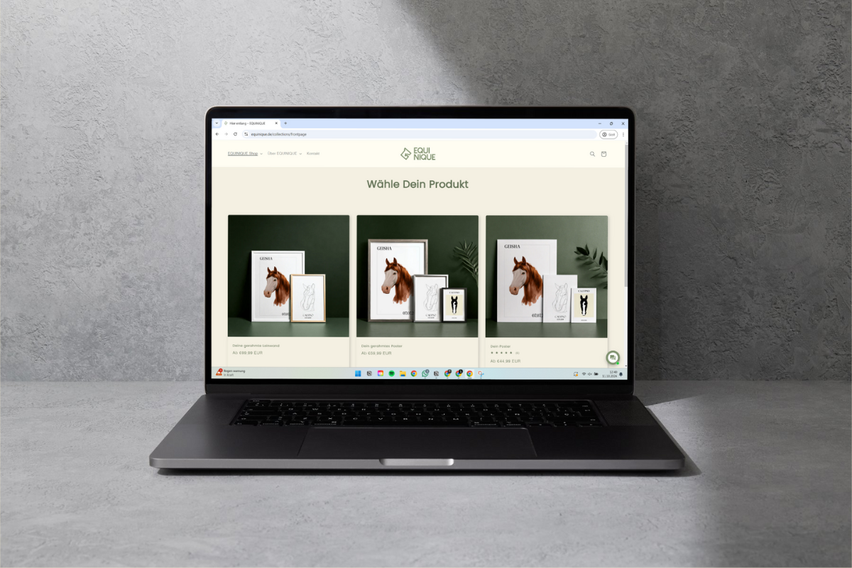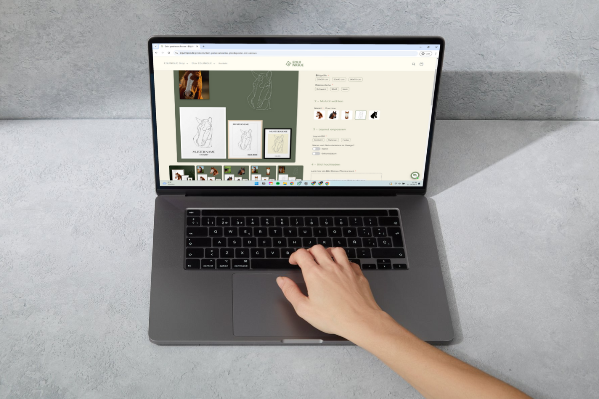 Schau Dich im EQUINIQUE-Shop um und wähle eines der von uns angebotenen Produkte aus, auf dem dein Pferd abgebildet werden soll. Beachte das es je nach Artikel auch verschiedene Verfahren gibt, wie das Design abgebildet werden kann: Druck oder Stick